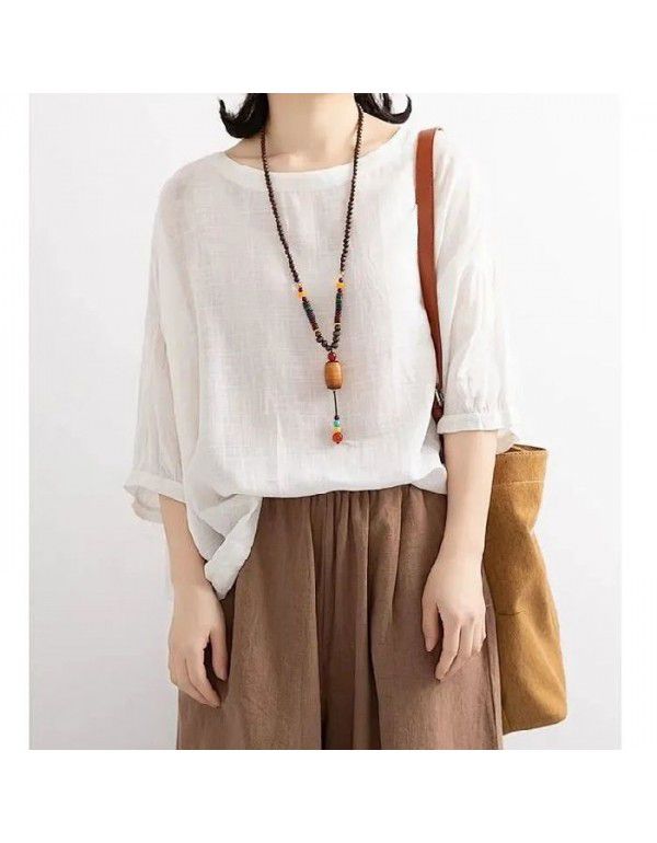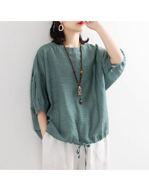 Loose casual T-shirt Women's Bat Shirt Drawcord Round Neck Medium Sleeve Imitation Cotton Linen Shirt Top Summer