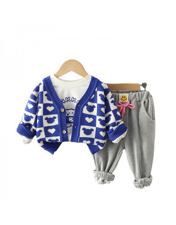 Autumn Girls' Knitted Cardigan Coat Printed Long Sleeve T-shirt Casual Pants 3PK Set