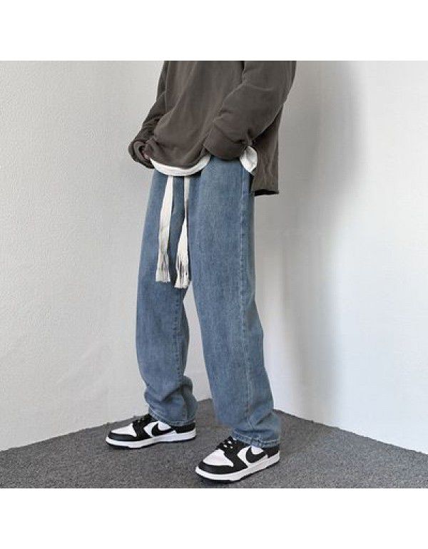 Men's jeans Spring new style drawstring loose straight tube dad pants Men's trend Korean wide leg mop pants