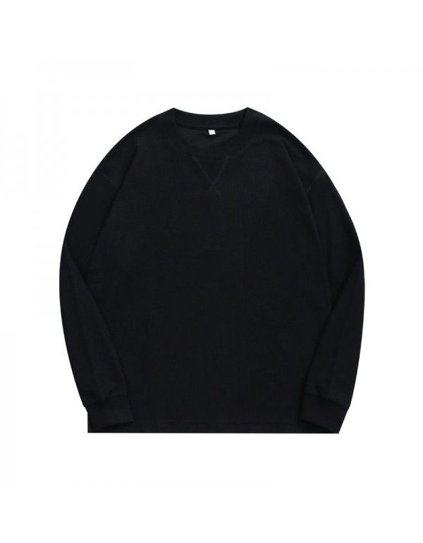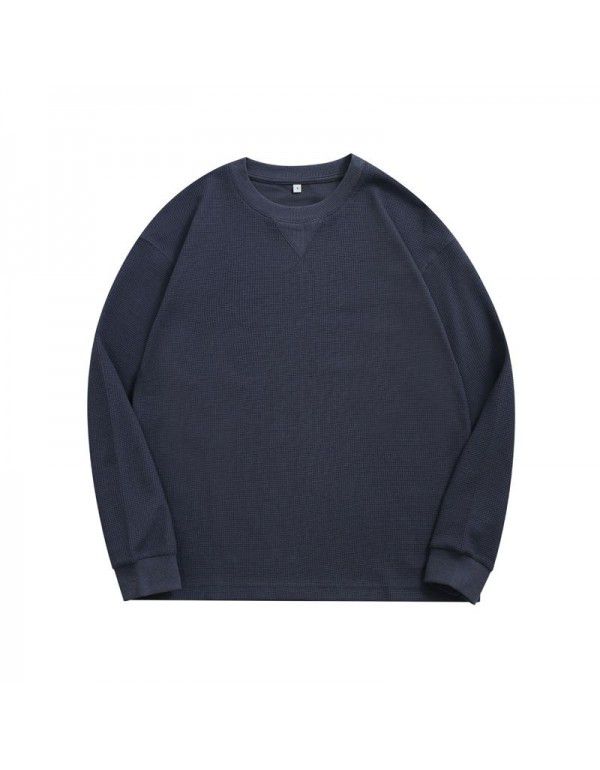 Waffle Long Sleeve T-shirt Men's Heavyweight Round Neck Loose Base Solid T-shirt